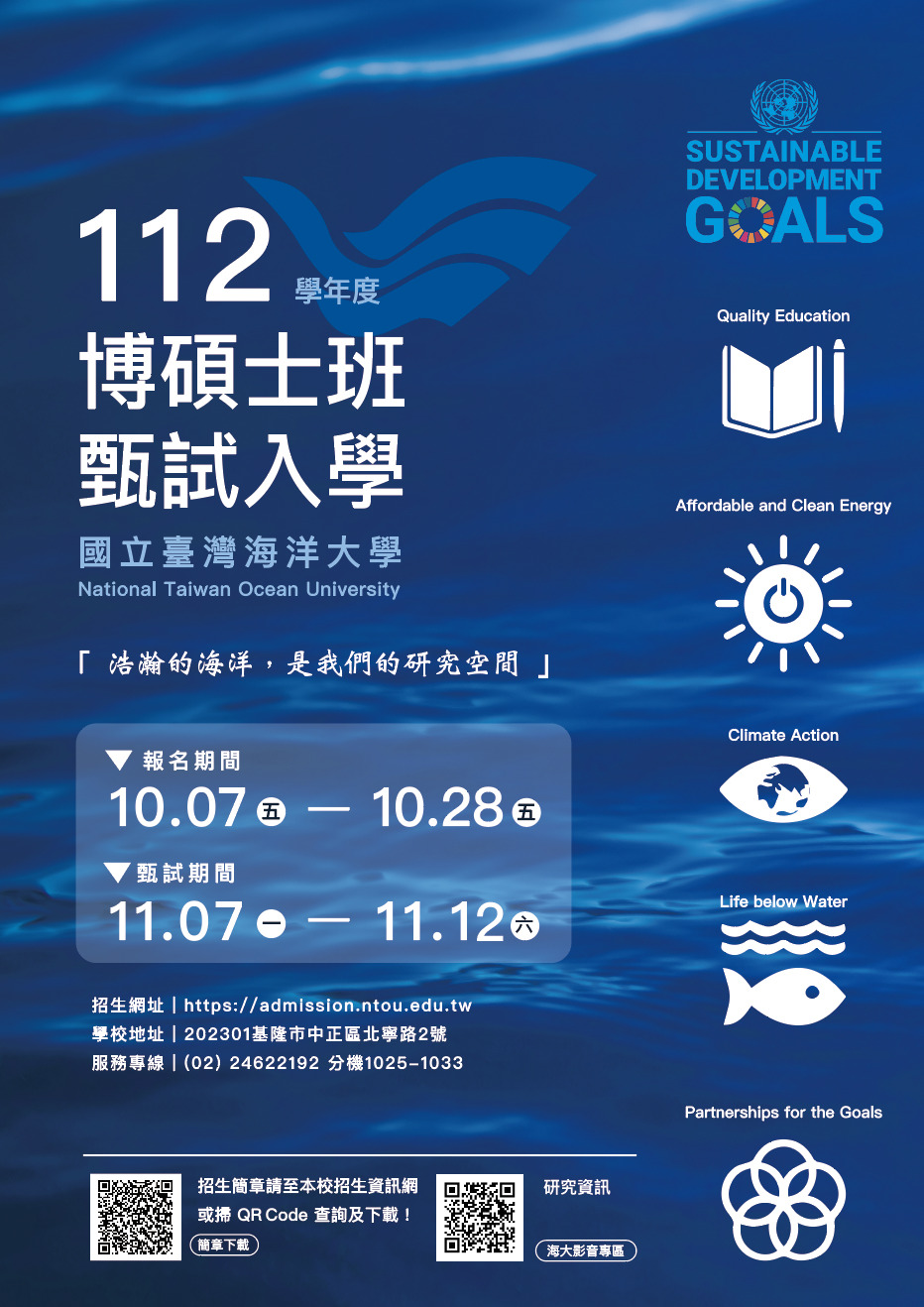 二、招生簡章及詳細資訊:請參見本校招生資訊網( https://admission.ntou.edu.tw/info.aspx?v=2383 )。招生簡章不另發售紙本,可於前揭網頁下載。