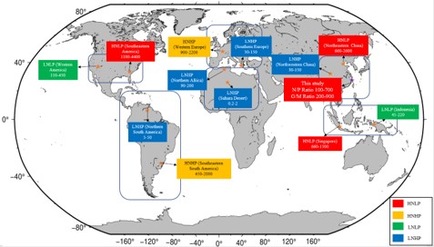 陳宏瑜老師研究:本研究依據Galloway與Mahowald的大氣氮和磷通量模型,將全球依其通量區分為:高氮高磷(HNHP)、高氮低磷(HNLP)、低氮高磷(LNHP)以及低氮低磷(LNLP)四種分布型態。